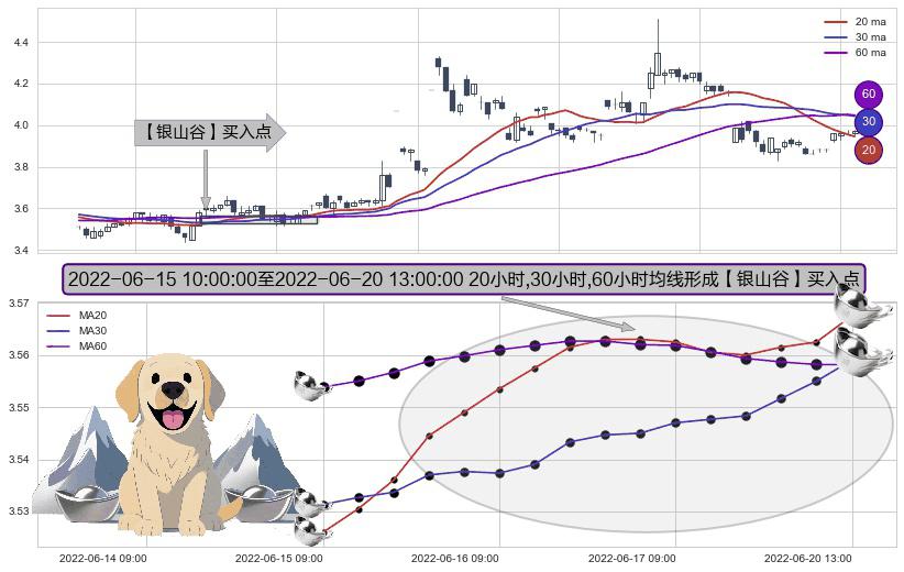 形态多维评估: ⚀ 2022-06-15 11:00:00-小时至2022-06-20 13:00:00-小时显现 20小时-30小时-60小时均线 【银山谷】买入点 看多信号,后市看涨,买入
