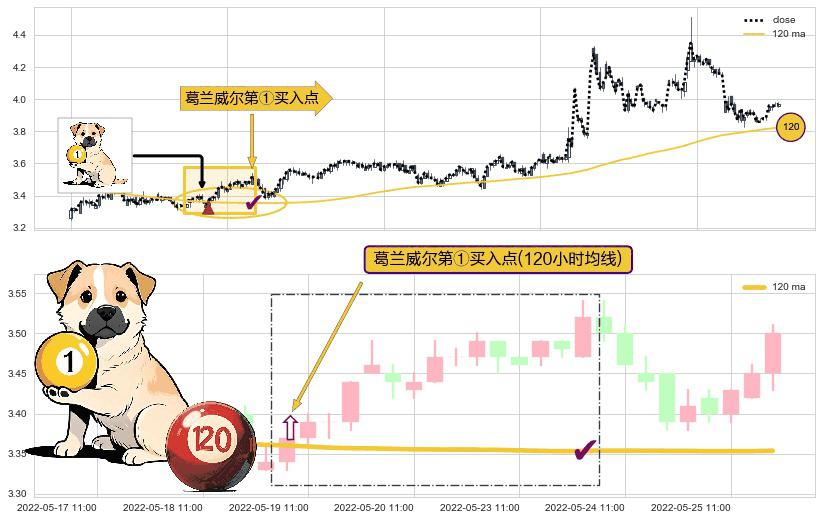 形态多维评估: ⚀ 2022-05-19 10:00:00-小时显现 葛兰威尔均线 120小时均线 第买①入点 走势反转见底信号,后市看涨,买进信号