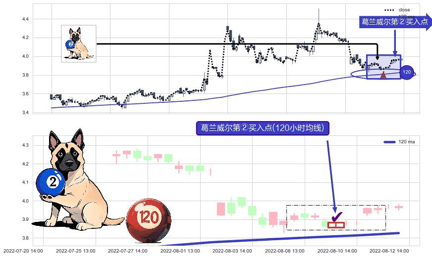 形态多维评估: ⚀ 2022-08-09 14:00:00-小时显现 葛兰威尔均线 120小时均线 第②买入点 上升趋势的中继信号,后市看涨,买进信号