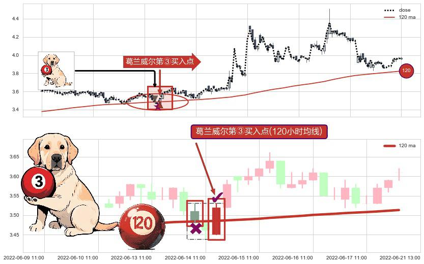 形态多维评估: ⚀ 2022-06-14 13:00:00-小时显现 葛兰威尔均线 120小时均线 第③买入点 上升趋势的中继信号,后市看涨,买进信号
