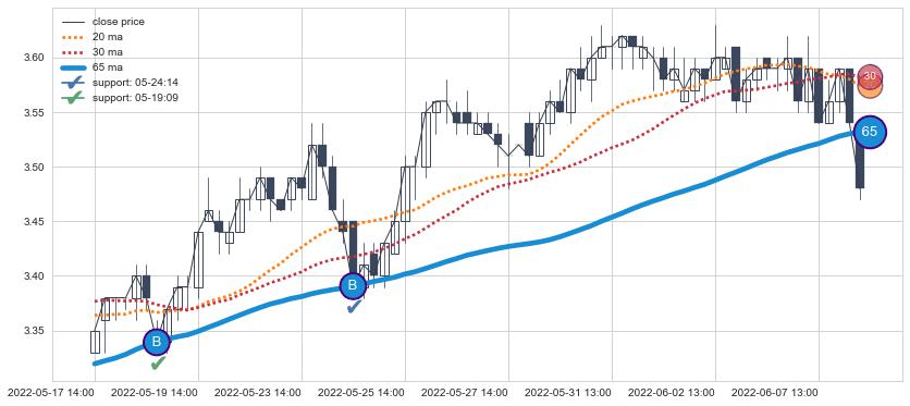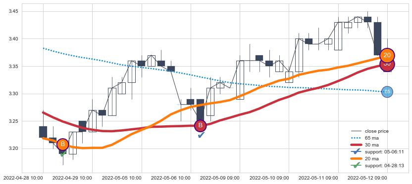 上涨趋势05-17 14:00-06-08 11:00,均线65确认关键支撑2处