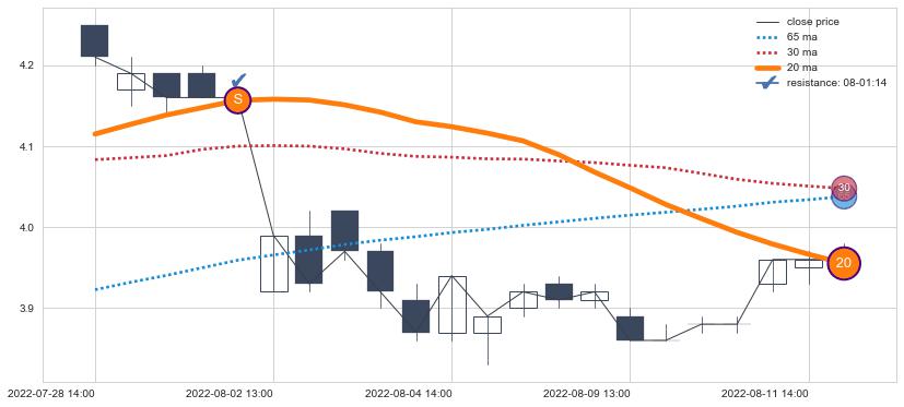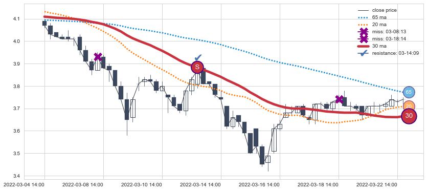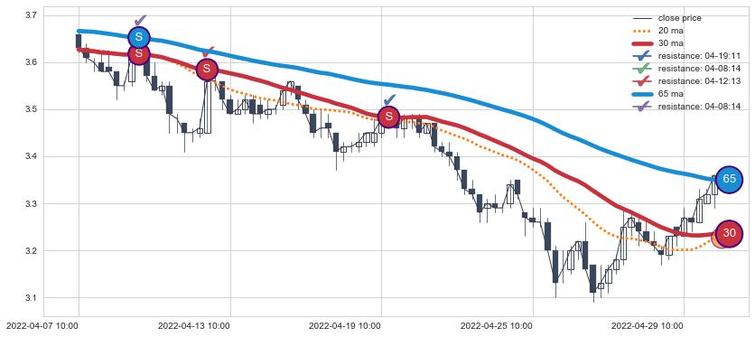 下跌趋势04-07 10:00-05-05 09:00,均线65, 30确认关键阻力3处