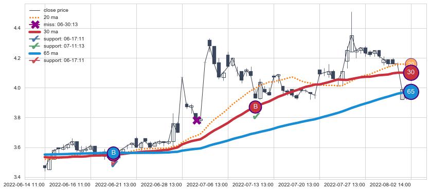 上涨趋势06-14 11:00-08-02 14:00,均线65, 30确认关键支撑2处