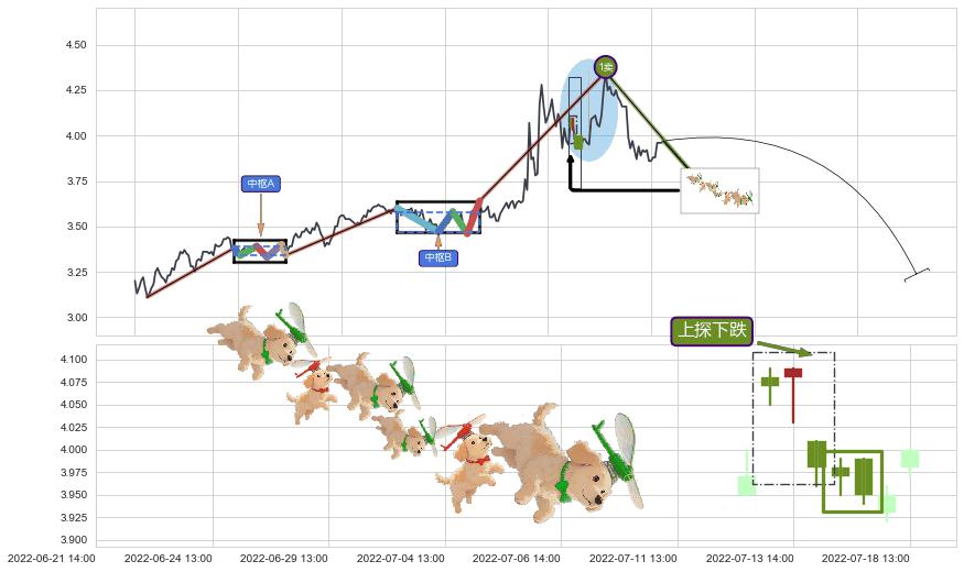 从2022-07-04 13:00至2022-08-12 14:00,共包含60个小时,阶段股价下跌-6.77%,阶段股价变动位移路程比: 1 : 10