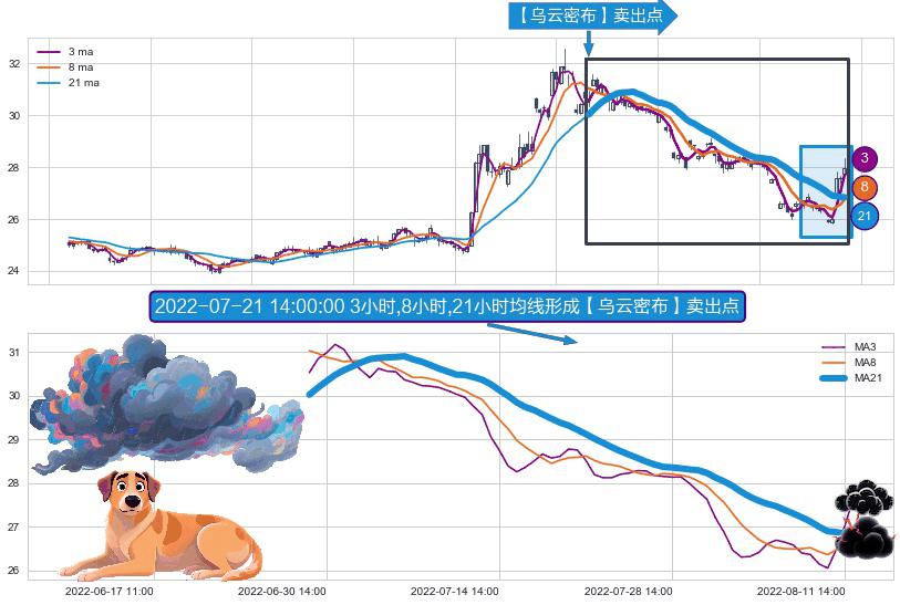 形态多维评估: ⚀ 2022-06-29 14:00:00小时-2022-08-12 13:00:00小时显现 3小时-8小时-21小时均线 【乌云密布】卖出点 看空信号,后市看跌,卖出