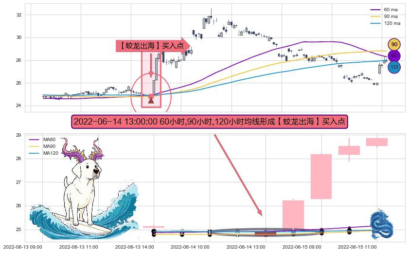 形态多维评估: ⚀ 2022-06-14 13:00:00小时显现 60小时-90小时-120小时均线 【蛟龙出海】买入点 看多信号,后市看涨,买入