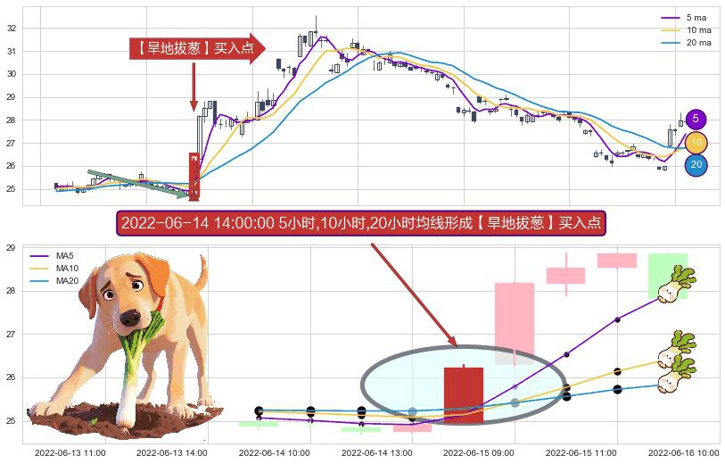 形态多维评估: ⚀ 2022-06-14 14:00:00小时显现 5小时-10小时-20小时均线 【旱地拔葱】买入点 看多信号,后市看涨,买入