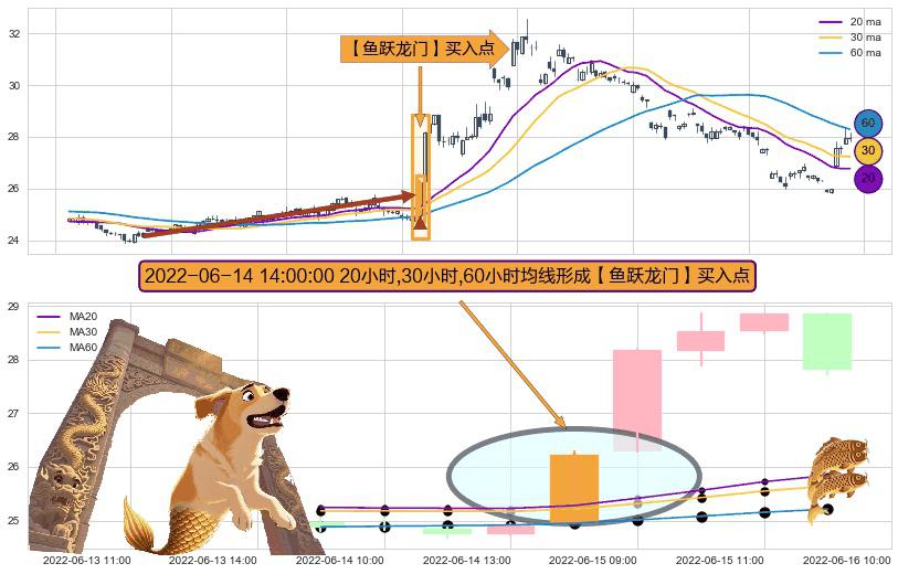 形态多维评估: ⚀ 2022-06-14 14:00:00小时显现 20小时-30小时-60小时均线 【鱼跃龙门】买入点 看多信号,后市看涨,买入