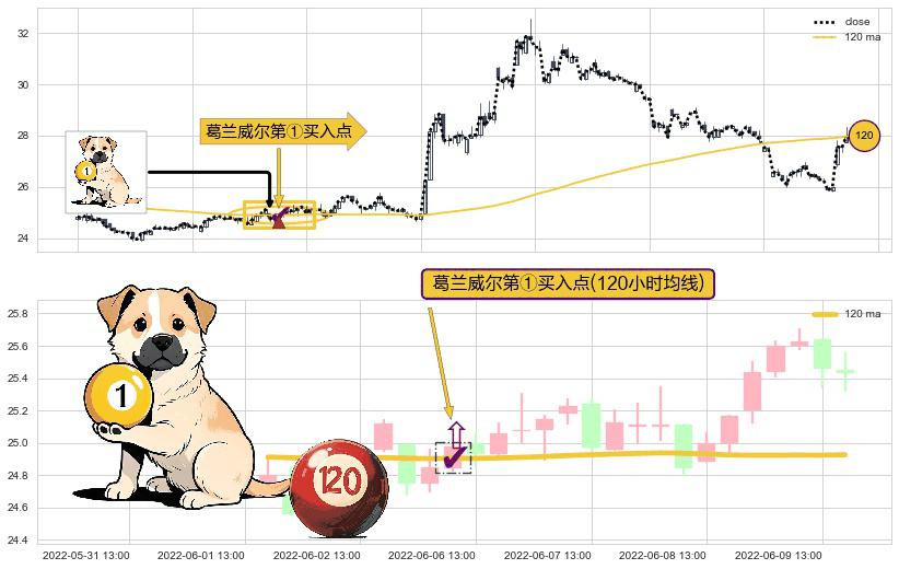 形态多维评估: ⚀ 2022-06-06 11:00:00-小时显现 葛兰威尔均线 120小时均线 第买①入点 走势反转见底信号,后市看涨,买进信号