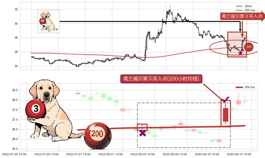 形态多维评估: ⚀ 2022-08-11 13:00:00-小时显现 葛兰威尔均线 200小时均线 第③买入点 上升趋势的中继信号,后市看涨,买进信号
