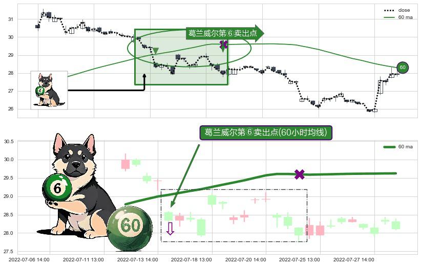 形态多维评估: ⚀ 2022-07-14 13:00:00-小时显现 葛兰威尔均线 60小时均线 第⑥卖出点 走势反转见顶信号,后市看跌,卖出信号