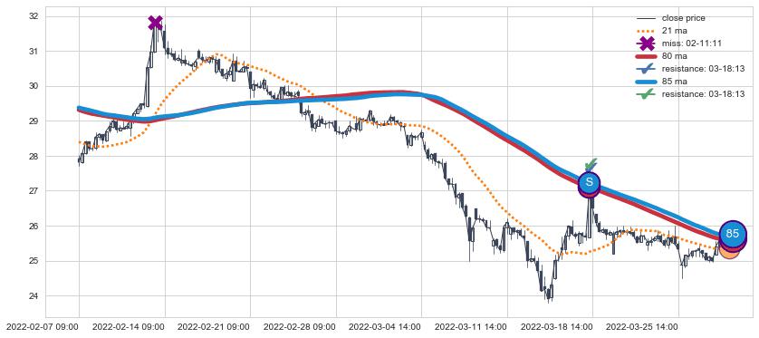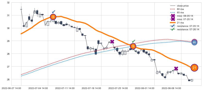 下跌趋势06-27 14:00-08-10 14:00,均线21确认关键阻力2处