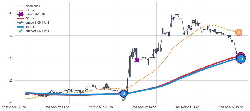 上涨趋势05-31 11:00-07-14 13:00,均线80, 85确认关键支撑1处