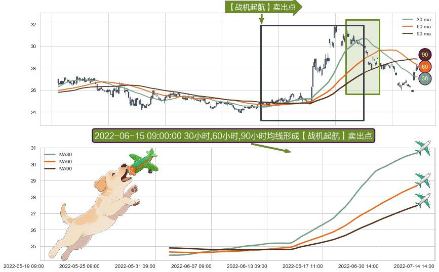 形态多维评估: ⚀ 2022-06-01 09:00:00小时-2022-07-11 14:00:00小时显现 30小时-60小时-90小时均线 【战机起航】卖出点 看空信号,后市看跌,卖出