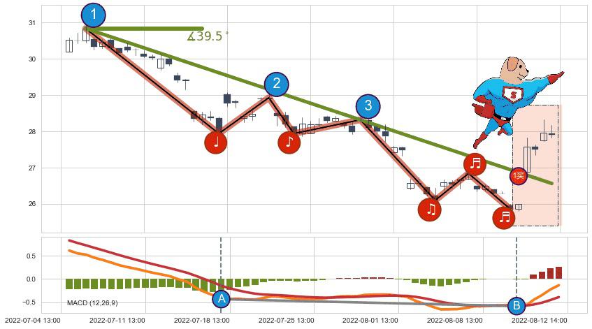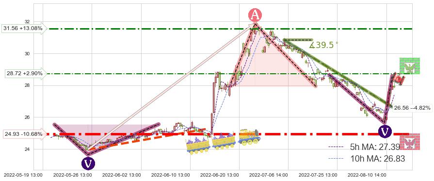 ➣ 2022-07-05 14:00-2022-08-11 14:00下跌趋势存在反转上涨[机会],其原下跌趋势的阻力位(26.56)已被突破[强支撑信号],原下跌趋势角度: 39.5˚