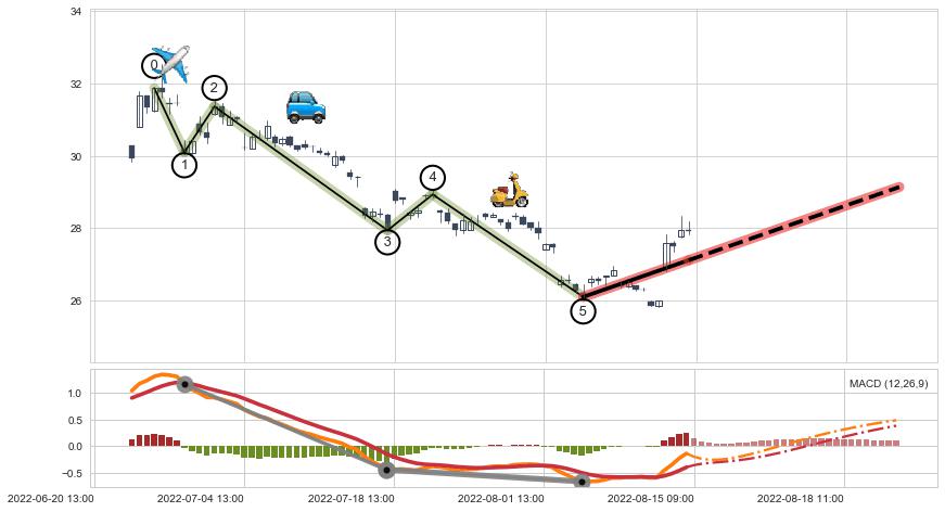 ➣ 第一, 三, 五浪下跌动能逐渐【衰弱变小】,趋势呈现不稳迹象