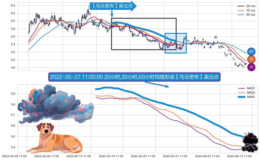 ⚀ 2022-05-16 09:00:00小时-2022-06-10 14:00:00小时显现 20小时-30小时-60小时均线 【乌云密布】卖出点 看空信号,后市看跌,卖出