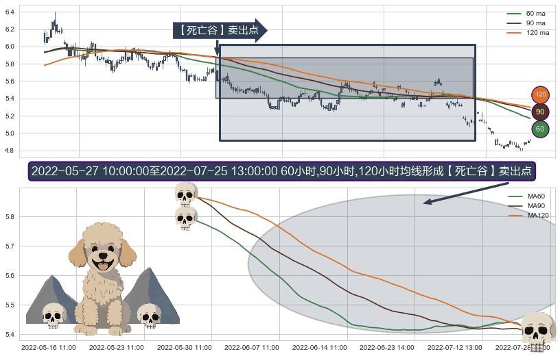 ⚀ 2022-05-27 11:00:00-小时至2022-07-25 13:00:00-小时显现 60小时-90小时-120小时均线 【死亡谷】卖出点 看空信号,后市看跌,卖出