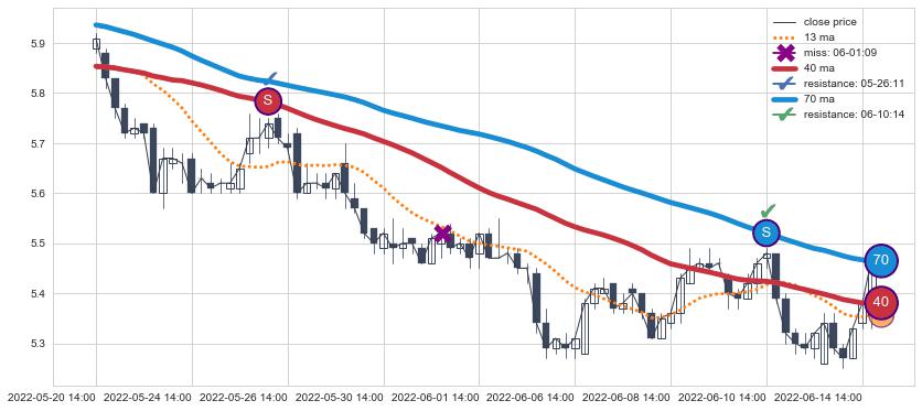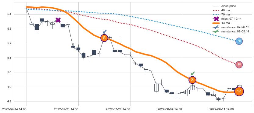 ⚂ 2022-06-29 13:00:00-小时均线向上突破,2022-07-14 13:00:00-小时重新下穿均线破位,均线阻力再次生效