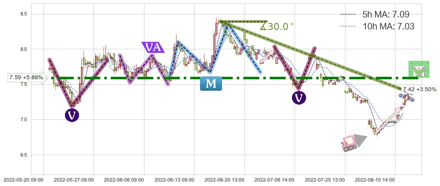 2022-06-13: 第一阻力位7.59起到了持续的支撑作用,有效地促进了价格的回升。