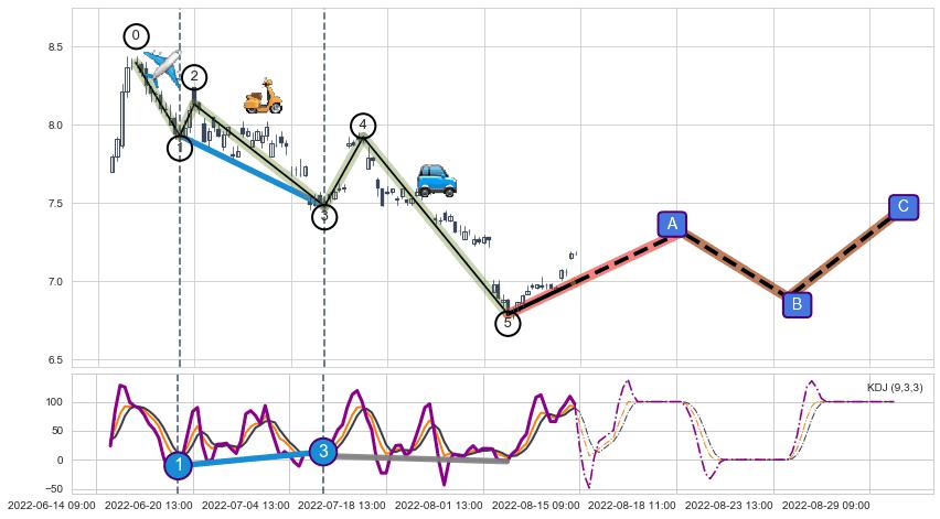 从2022-06-24 13:00至2022-06-29 14:00,共包含8个小时,阶段股价上涨2.43%,阶段股价变动位移路程比: 1 : 1.9