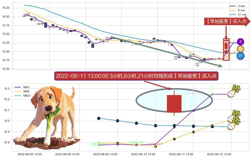 形态多维评估: ⚀ 2022-08-11 13:00:00小时显现 3小时-8小时-21小时均线 【旱地拔葱】买入点 看多信号,后市看涨,买入
