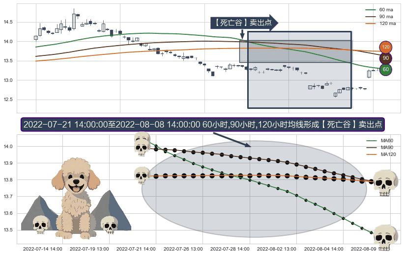 形态多维评估: ⚀ 2022-07-22 13:00:00-小时至2022-08-08 14:00:00-小时显现 60小时-90小时-120小时均线 【死亡谷】卖出点 看空信号,后市看跌,卖出