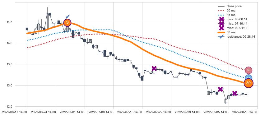 上涨趋势05-26 13:00-06-30 14:00,均线60, 45确认关键支撑3处