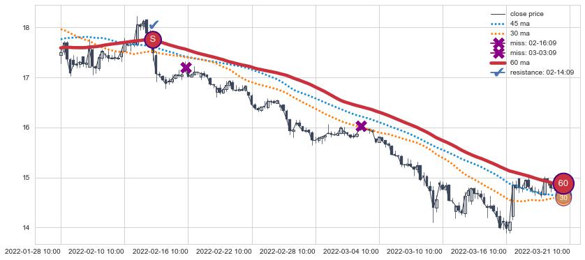 下跌趋势01-28 10:00-03-21 10:00,均线60确认关键阻力1处