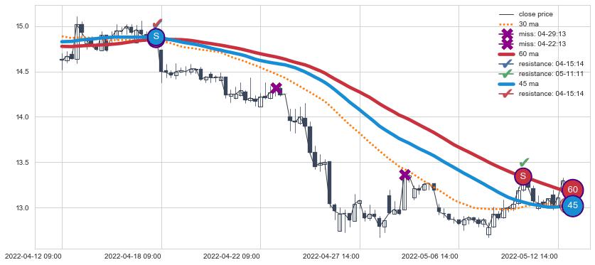 下跌趋势04-12 09:00-05-13 09:00,均线60, 45确认关键阻力2处
