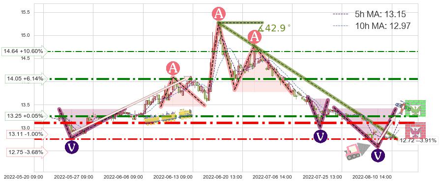 ⚔️ 2022-06-15 13:00-2022-08-11 13:00下跌趋势存在反转上涨[机会],其原下跌趋势的阻力位(12.72)已被突破[强支撑信号],原下跌趋势角度: 42.9˚