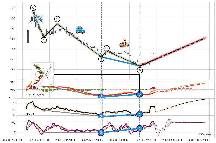 ➣ 1,3,5驱动浪MACD, RSI, KDJ走势都出现【常规背离】反转信号增强