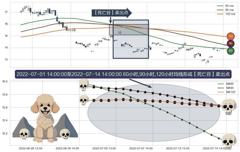 ⚀ 2022-07-04 13:00:00-小时至2022-07-14 14:00:00-小时显现 60小时-90小时-120小时均线 【死亡谷】卖出点 看空信号,后市看跌,卖出