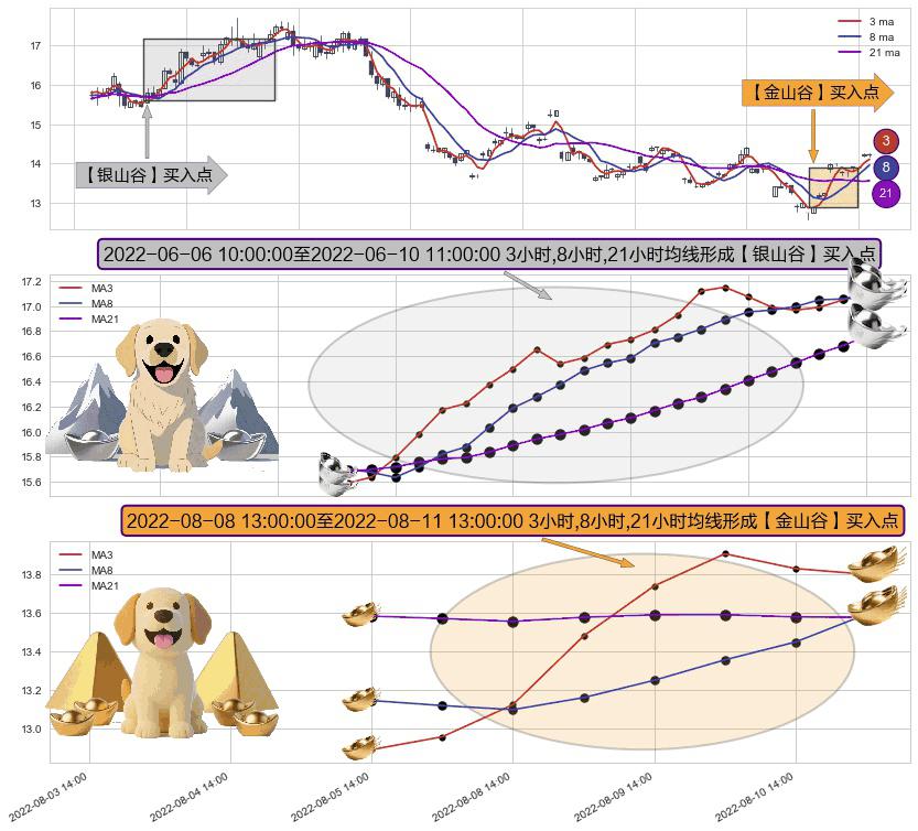 ⚃ 2022-08-08 14:00:00-小时至2022-08-11 13:00:00-小时显现 3小时-8小时-21小时均线 【金山谷】买入点 其再次确认了买入信号,可靠性更强,买入