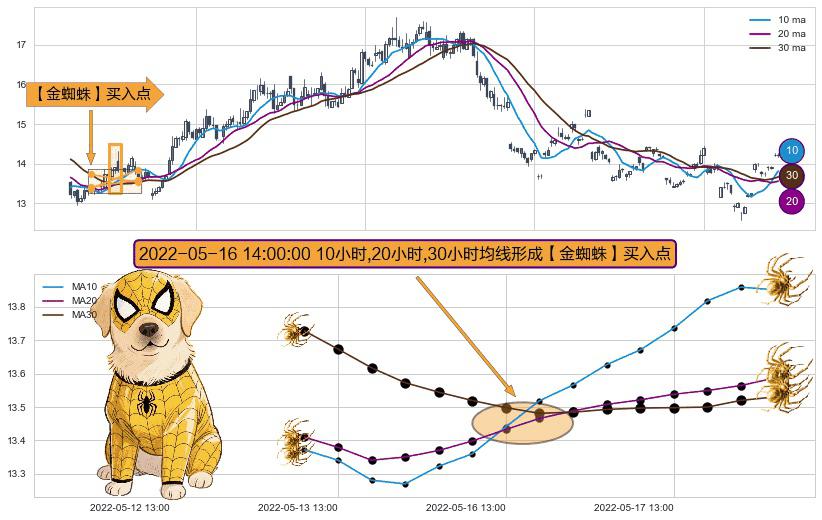 ⚀ 2022-05-16 14:00:00小时显现 10小时-20小时-30小时均线 【金蜘蛛】买入点 看多信号,后市看涨,买入
