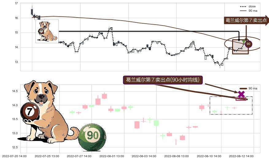 ⚀ 2022-08-12 13:00:00-小时显现 葛兰威尔均线 90小时均线 第⑦卖出点 下降趋势的中继信号,后市看跌,卖出信号
