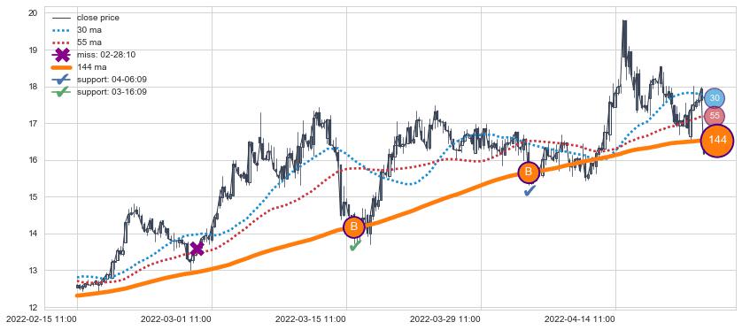 ⚁ MA3和MA8走势平行,且始终保持在短距离内,MA21始终在短中期均线上方,与短中期均线保持一定的距离,微微下行