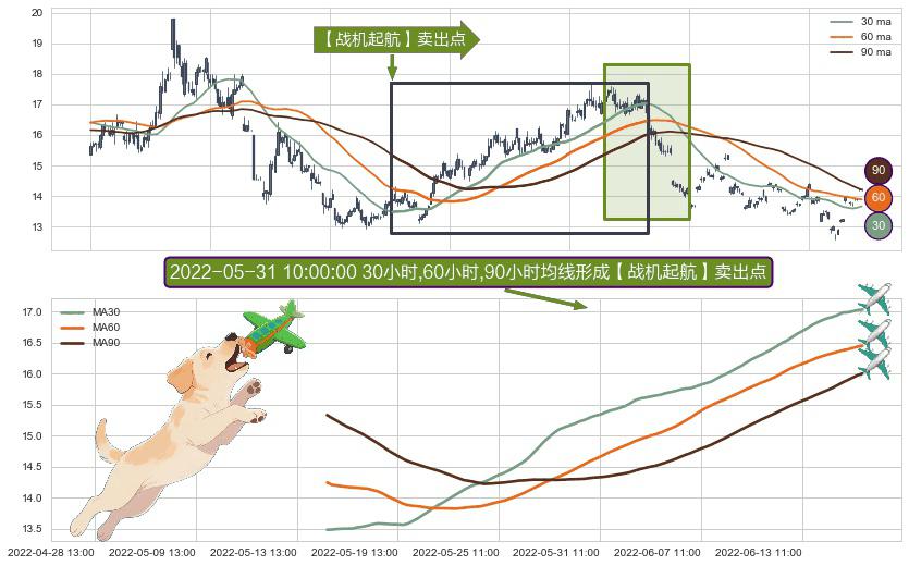 ⚀ 2022-05-16 14:00:00小时-2022-06-15 14:00:00小时显现 30小时-60小时-90小时均线 【战机起航】卖出点 看空信号,后市看跌,卖出