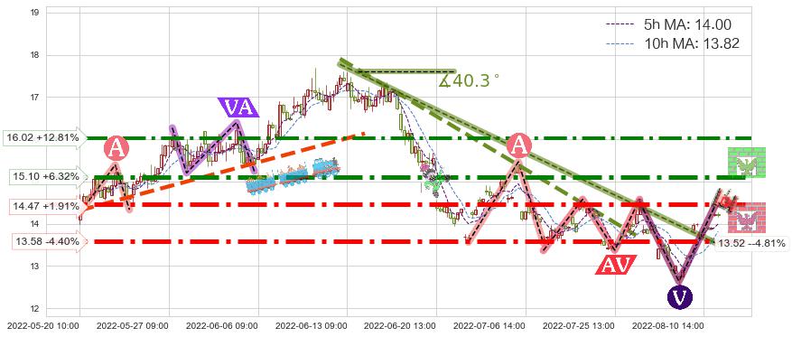 ♘ 阻力价格位15.10,可信任强度87.13%,距离最后交易2022-08-12 14:00形成的收盘价格14.20相差 +6.32%