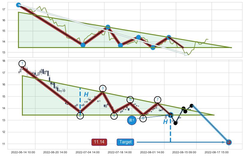➣ 最小中继整理跌幅→𝐇: 2.301 (下侧直角边第一支撑点②与斜边垂直距离)