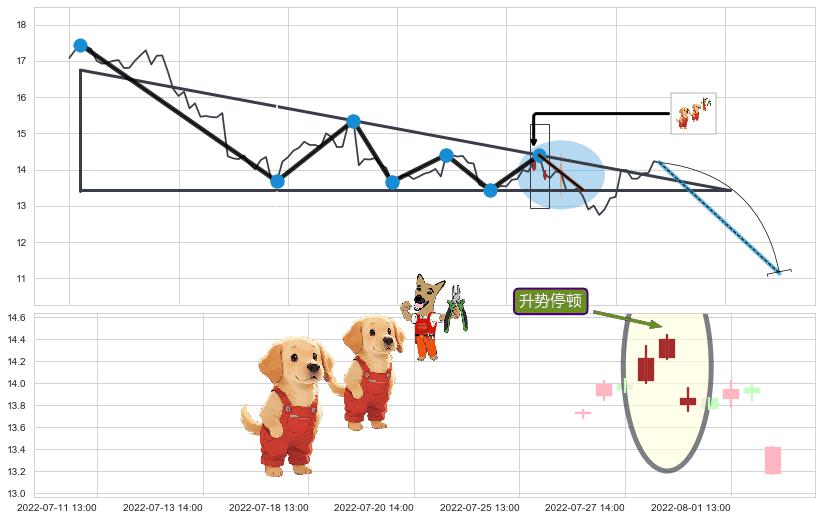 从2022-07-28 14:00至2022-08-12 14:00,共包含23个小时,阶段股价下跌-0.95%,阶段股价变动位移路程比: 1 : 33