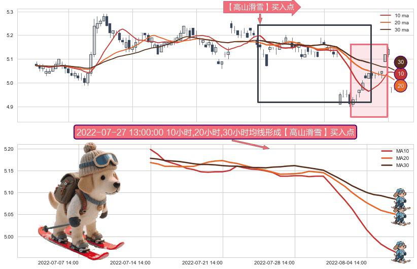 ⚀ 2022-07-14 14:00:00小时-2022-08-08 14:00:00小时显现 10小时-20小时-30小时均线 【高山滑雪】买入点 看多信号,后市看涨,买入