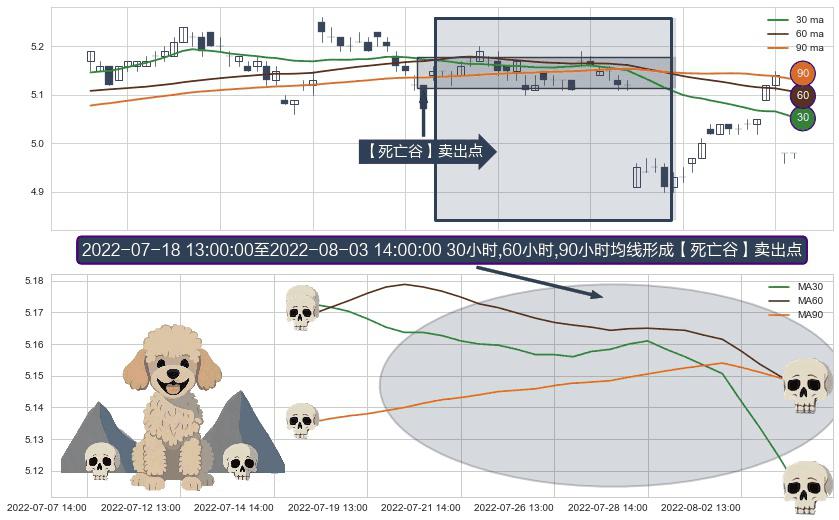 ⚀ 2022-07-18 14:00:00-小时至2022-08-03 14:00:00-小时显现 30小时-60小时-90小时均线 【死亡谷】卖出点 看空信号,后市看跌,卖出