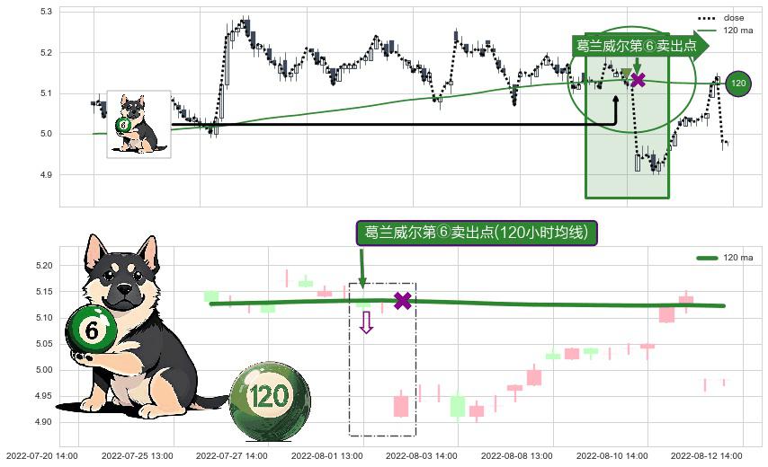 ⚀ 2022-08-01 13:00:00-小时显现 葛兰威尔均线 120小时均线 第⑥卖出点 走势反转见顶信号,后市看跌,卖出信号