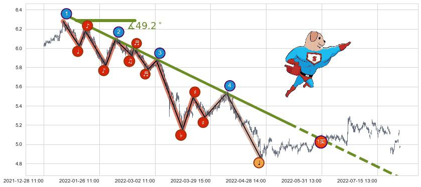⚔️ 2022-01-07 11:00-2022-05-13 13:00下跌趋势存在反转上涨[机会],其原下跌趋势的阻力位(4.65)已被突破[强支撑信号],原下跌趋势角度: 49.2˚