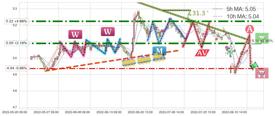 ➢ 【仅预测突破】最后价格:4.98与预测突破价格:5.15→【空间较大】后续最小【整理】第一目标价格→(08-25:14: 5.51 )