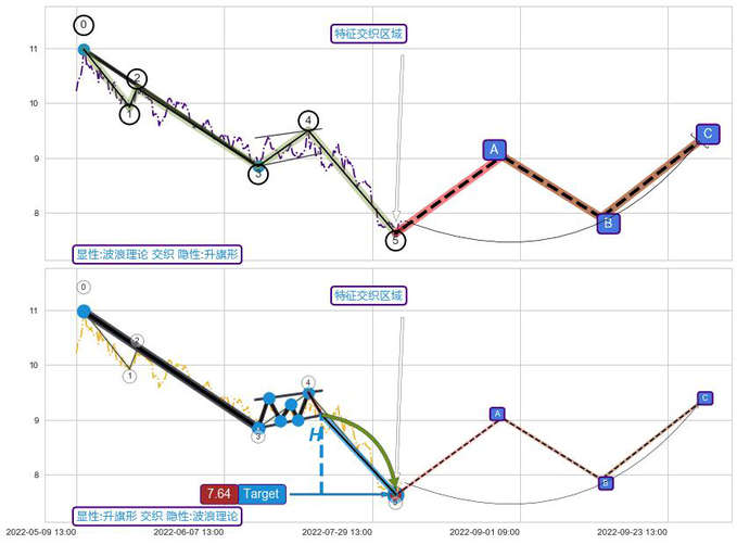 ➢ 波浪理论与升旗形信号事件周期长度级别相同,同周期信号事件