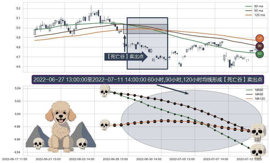 ⚀ 2022-06-27 14:00:00-小时至2022-07-11 14:00:00-小时显现 60小时-90小时-120小时均线 【死亡谷】卖出点 看空信号,后市看跌,卖出