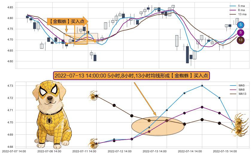 ⚀ 2022-07-13 14:00:00小时显现 5小时-8小时-13小时均线 【金蜘蛛】买入点 看多信号,后市看涨,买入