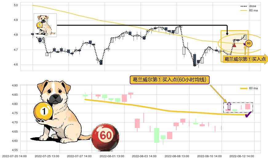 ⚀ 2022-08-11 13:00:00-小时显现 葛兰威尔均线 60小时均线 第买①入点 走势反转见底信号,后市看涨,买进信号